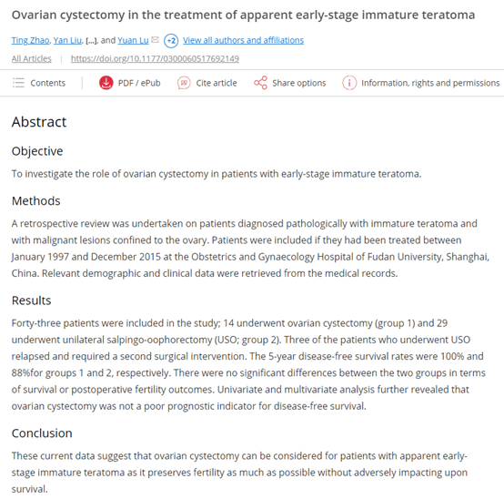 女性朋友們先不要太緊張!以統計學來看呢,停經前的女性發現此類腫瘤的時候,都只有影響到單側的卵巢,以Stage I居多,而且因為這類腫瘤侵犯到另一側的卵巢機率很低,所以可以做保留生育的手術(Fertility-sparing surgical staging),意思就是只要切除單側的卵巢即可,不過在2017年的時候Zhao醫師等團隊收錄了1997年到2015年所有早期期別的不成熟畸胎瘤的病患(圖三),發現如果保留卵巢單做囊腫切除術(Cystectomy),其生存率是差不多的。總而言之,如果是早期的不成熟畸胎瘤,未來是可以生育的唷!