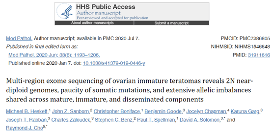 他們發覺畸胎瘤中體細胞基因變異的比例極低,也沒有發現特別的致病基因(Pathogenic mutations)。