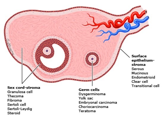 而卵巢的惡性腫瘤中,幾乎都是如下圖最右邊,是來自於卵巢的上皮組織分化而來,我們稱為上皮性卵巢癌(Epithelial ovarian cancer),此類卵巢癌約占了整體卵巢癌的80%以上,好發的年紀都是以停經後的婦女,且往往是在60歲以上。