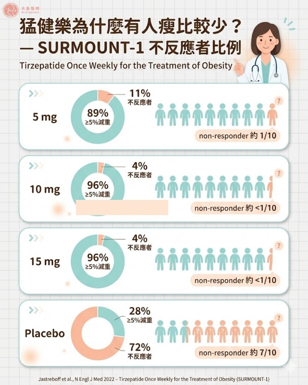 在 72 週療程結束時,體重沒有減少 5% 以上,就被歸類為「non-responder 不反應者」。