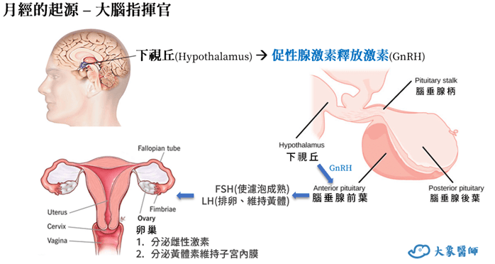但在進入細講月經週期之前,我們務必要知道,掌管這一切的最高司令官,是我們腦袋中的下視丘(Hypothalamus),他會以不同的形式對腦下垂體(Pituitary gland)發布命令。