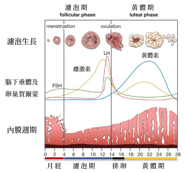 - 卵巢週期 è 濾泡期(10到14天) + 黃體期(14天)