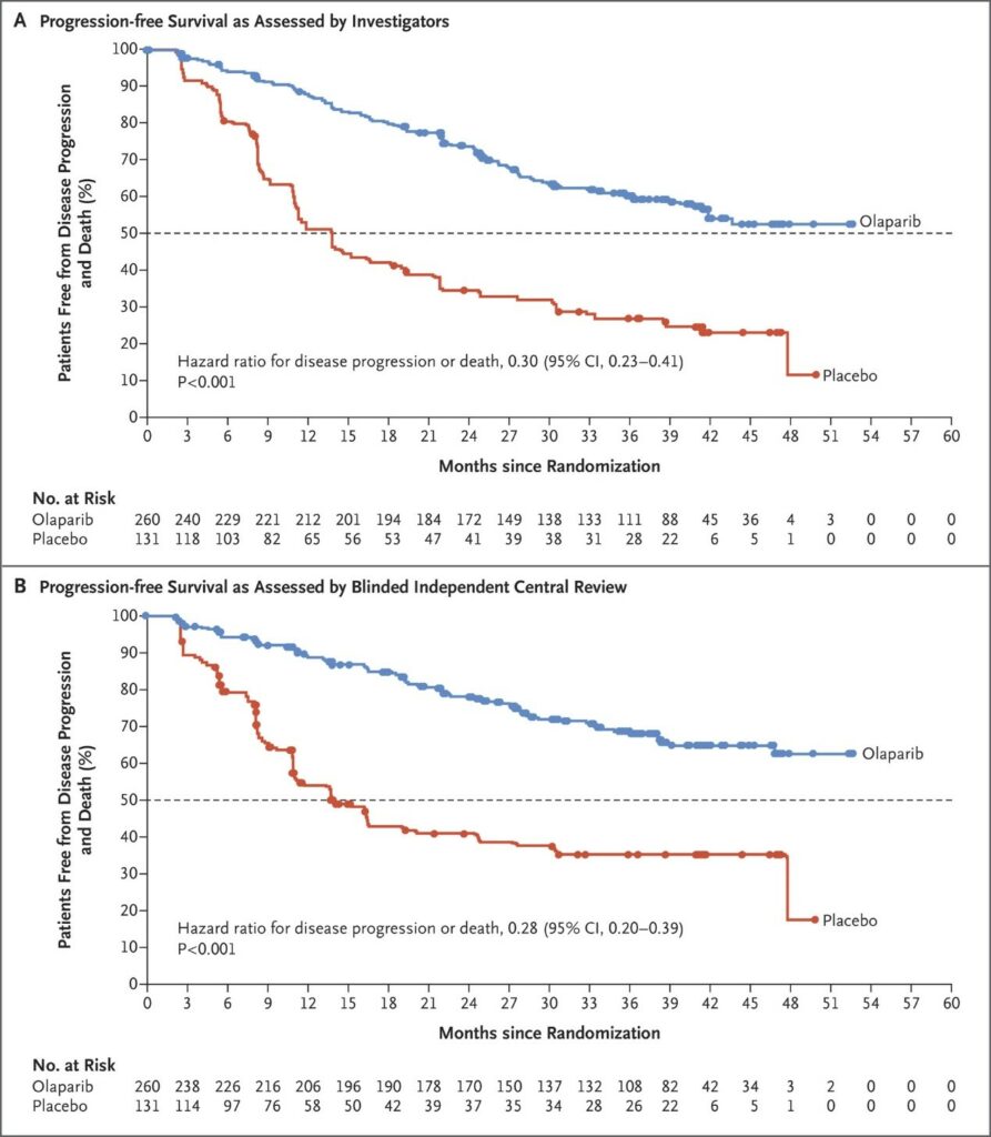( Eastern Cooperative Oncology Group performance status of 0–1 and with BRCA-mutated, newly diagnosed, advanced, high-grade serous or endometrioid ovarian cancer with a complete or partial clinical response after platinum-based chemotherapy)