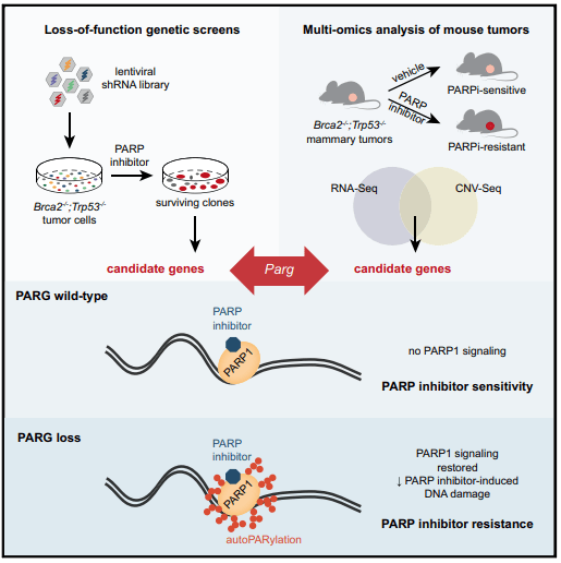 圖3:來自Selective Loss of PARG Restores PARylation and Counteracts PARP Inhibitor-Mediated Synthetic Lethality,說明腫瘤細胞因為PARG的缺失,讓PARP1的訊號重新活化,而對PARP抑制劑無效