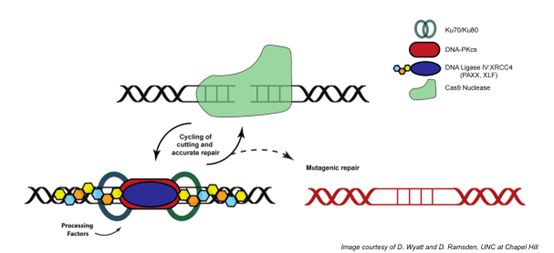 - 非同源染色體黏合(non-homologous end-joining, NHEJ)的修復